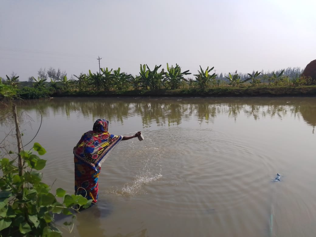 একজন প্রশিক্ষণ প্রাপ্ত চাষী পুকুরে মাছের খাদ্য দিচ্ছে।