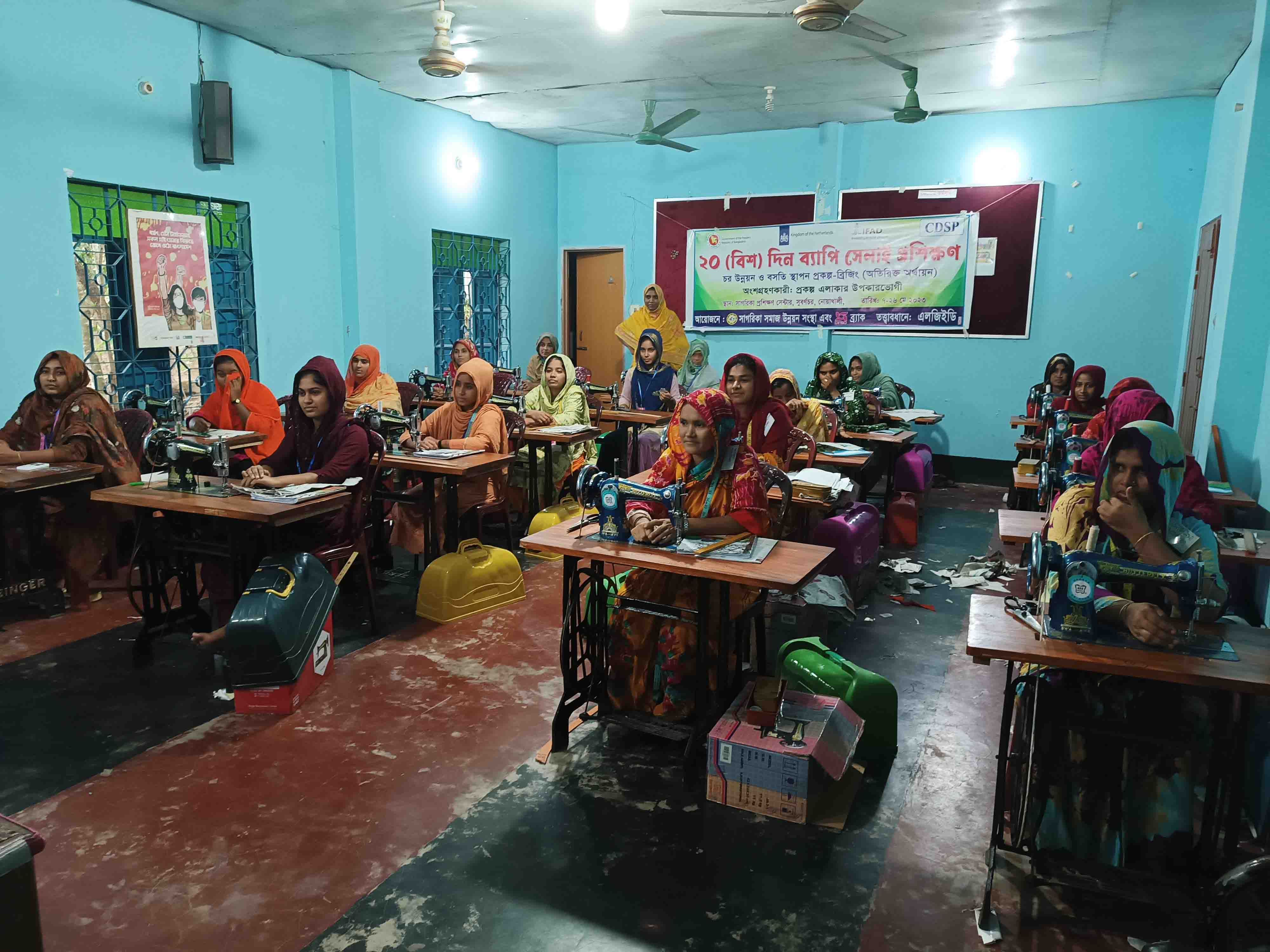 ২০দিন ব্যাপি সেলাই প্রশিক্ষণ কর্মশালায় সদস্যরা সেলাই প্রশিক্ষণ নিচ্ছেন।