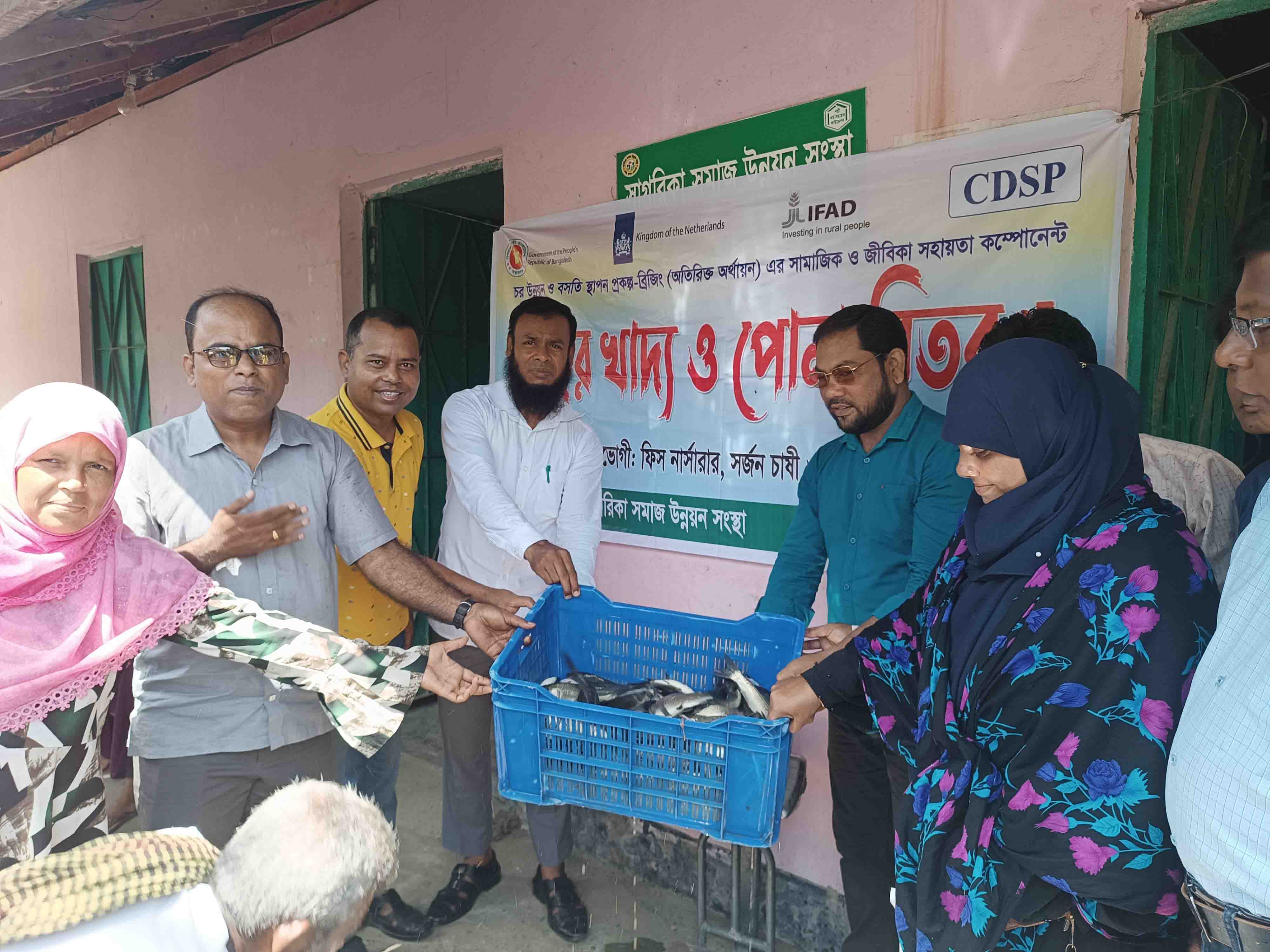 প্রশিক্ষণ প্রাপ্ত মৎস্য চাষীদের মাঝে মাছ বিতরণ।