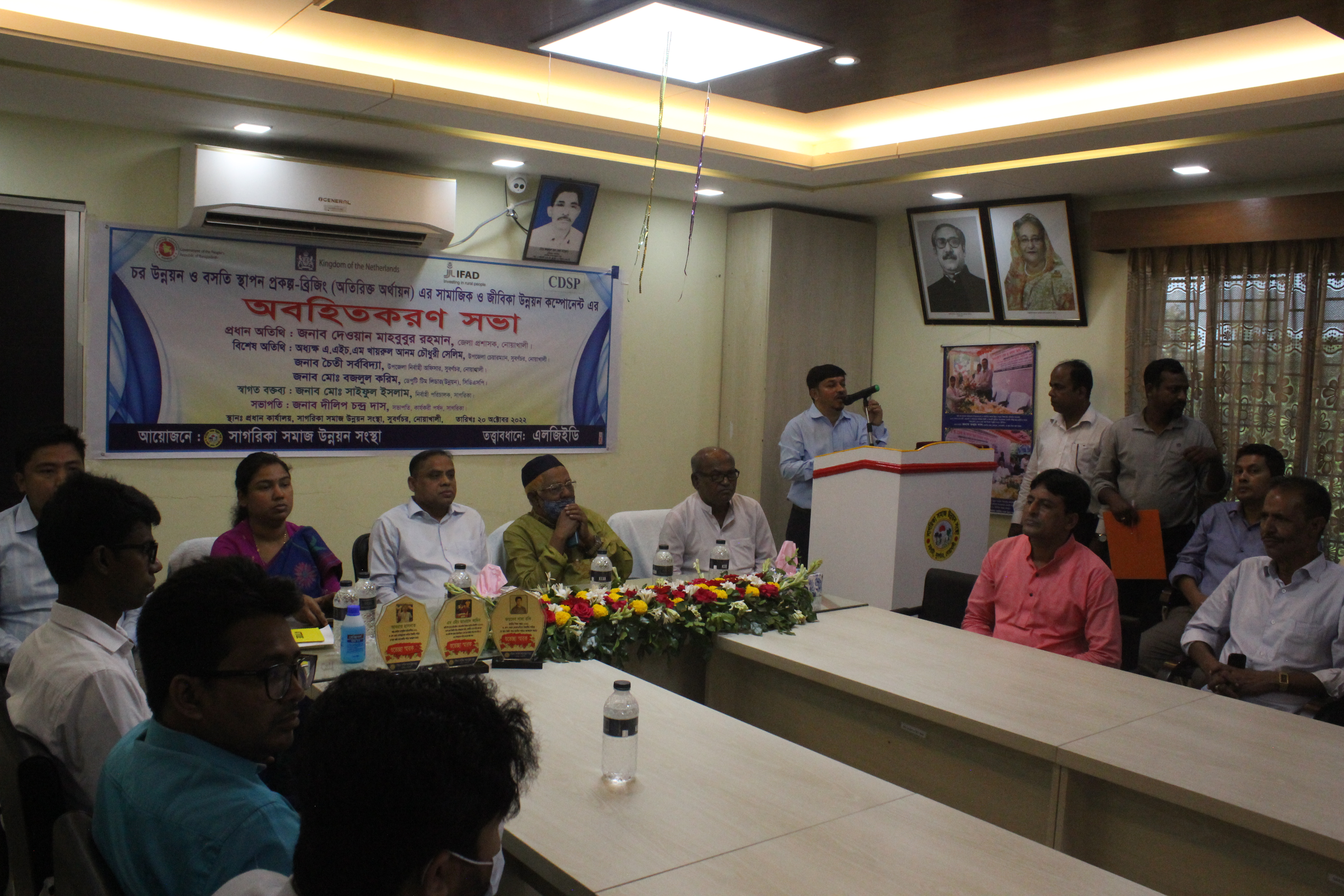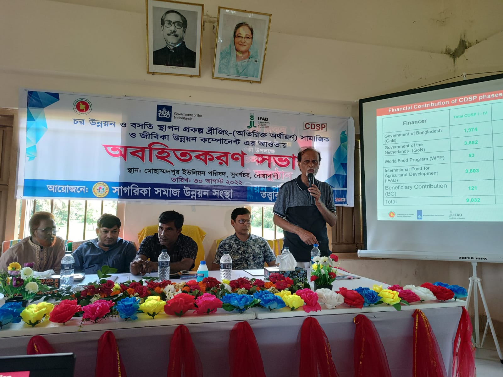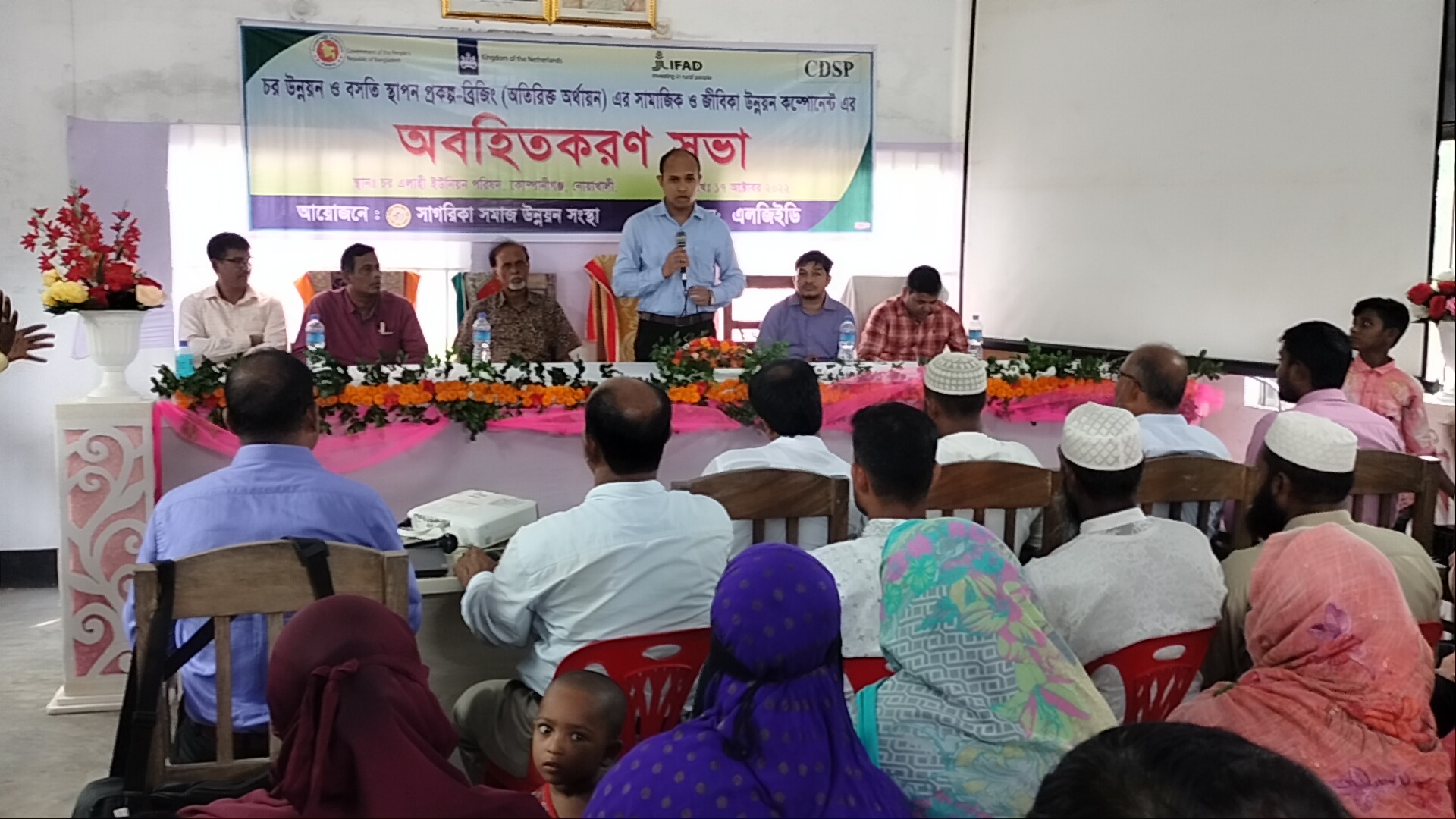 অবহিতকরণ সভাঃ প্রকল্পের শুরুতে বিভিন্ন স্টেকহোল্ডারদের নিয়ে ৩টি অবহিতকরণ সভা করা হয়। অবহিতকরণ সভায় প্রকল্পের সকল কার্যক্রম নিয়ে বিস্তারিত আলোচনা করা হয়। জেলার সুবর্ণচর উপজেলায় ২ টি এবং কোম্পানিগঞ্জ উপজেলায় ১টি অবহিত করণ সভার আয়োজন করা হয়। অবহিতকরণ সভায় নোয়াখালী জেলার মাননিয় জেলা প্রশাসক মহোদয় জনাব দেওয়ান মাহবুবুর রহমান, সুবর্ণচর উপজেলার উপজেলা চেয়ারম্যান জনাব আনম খায়রুল আনম চৌধুরী সেলিম, সুবর্ণচর উপজেলার উপজেলা নির্বাহী অফিসার জনাব চৈতী সর্ববিদ্যা, কোম্পানীগঞ্জ উপজেলার উপজেলা নির্বাহী অফিসার জনাব মোঃ মেছবাউল আলম ভূইয়া, সিডিএসপি প্রকল্পের ডেপুটি টিম লিডার(উন্নয়ন) জনাব মোঃ বজলুল করিম, সাগরিকা সমাজ উন্নয়ন সংস্থার নির্বাহী পরিচালক জনাব মোঃ সাইফুল ইসলাম, এলজিইডির এগ্রিকালচার অফিসার জনাব রবিউল ইসলামসহ সংস্থা বিভিন্ন স্তরের কর্মকর্তা, সিডিএসপি টিএ টিমের কর্মকর্তা, উপজেলা কৃষি, মৎস্য ও প্রাণিসম্পদ কর্মকর্তা, স্থানীয় গণ্যমাণ্য ব্যাক্তিবর্গ, প্রকল্প এলাকার বিভিন্ন শ্রেণির ব্যাক্তিগণ উপস্থিত ছিলেন।