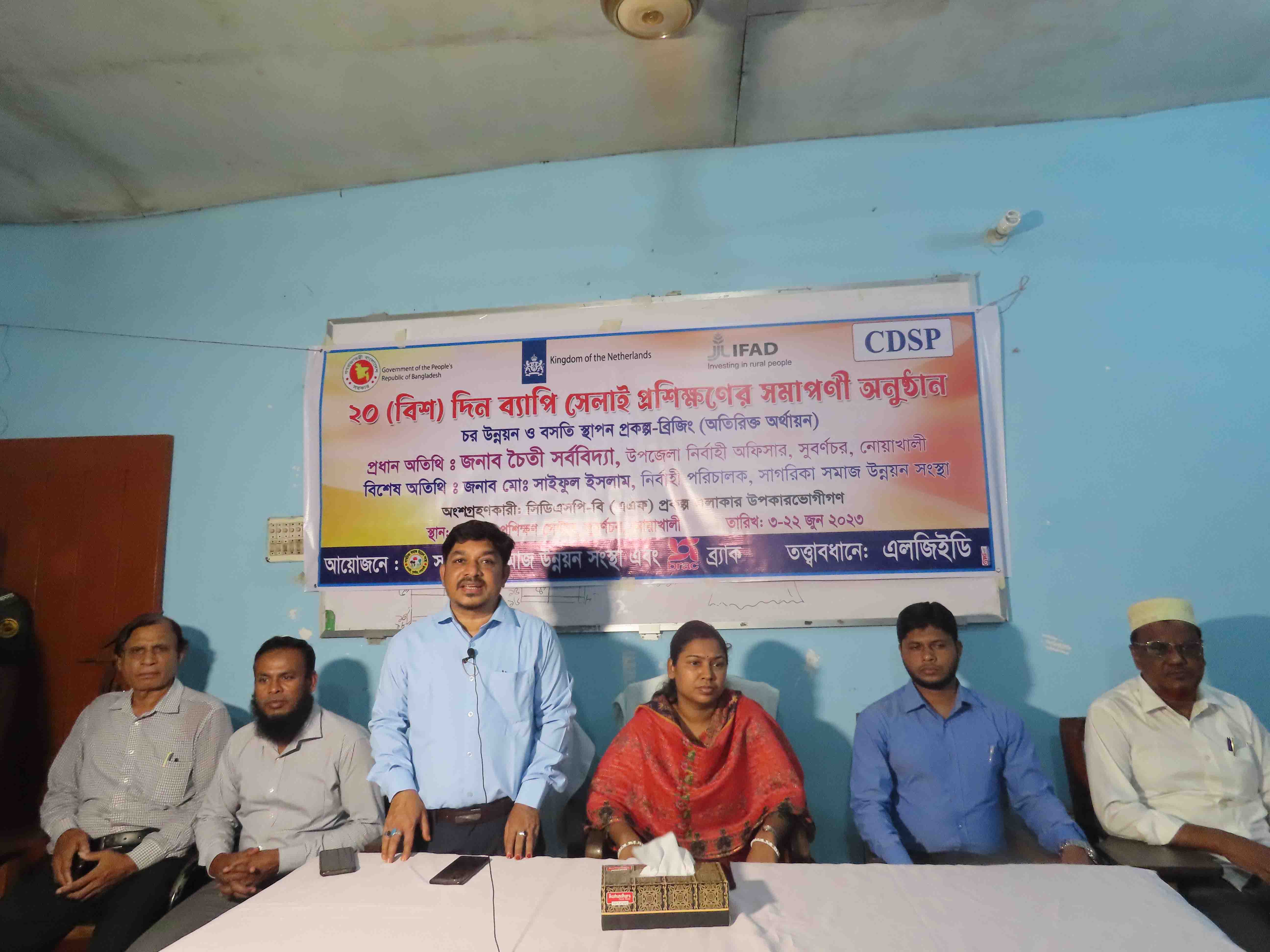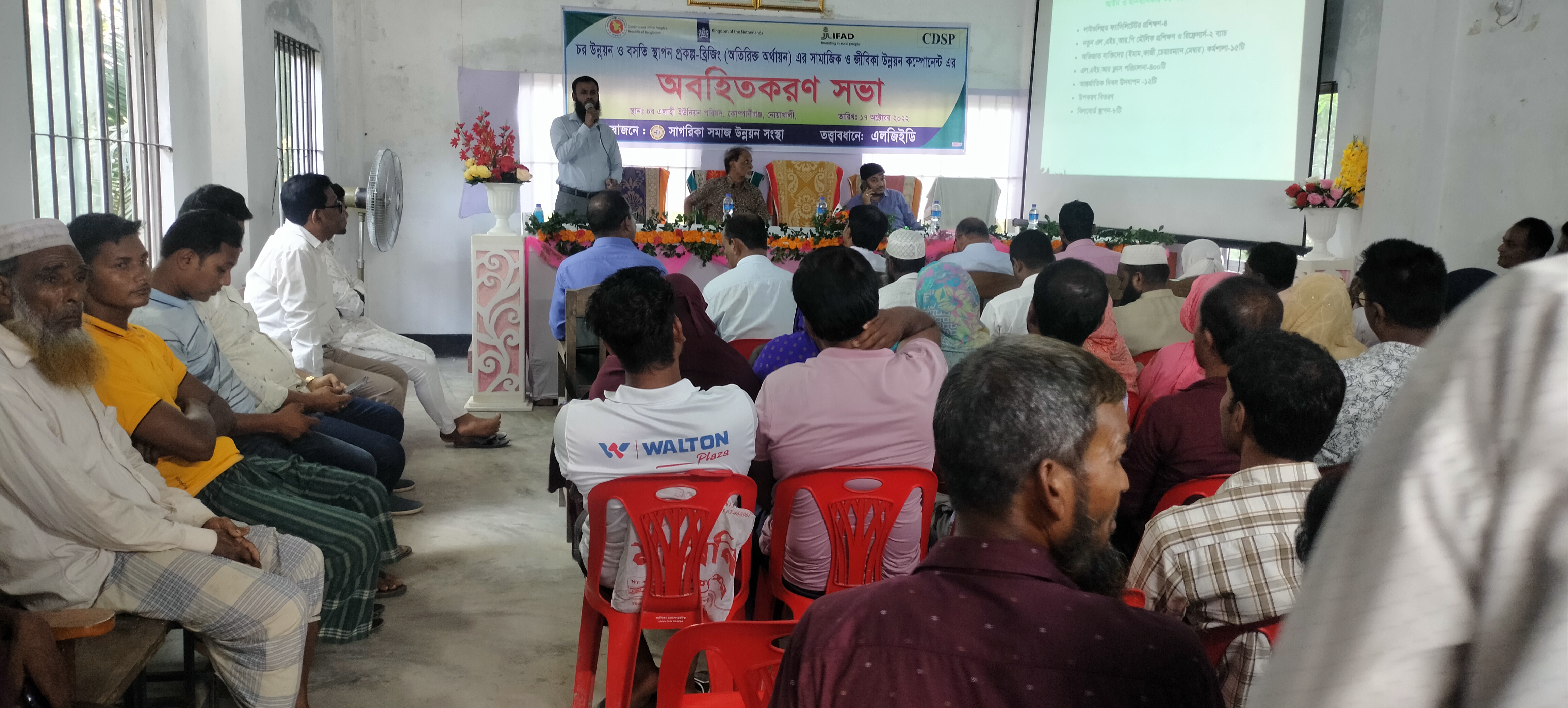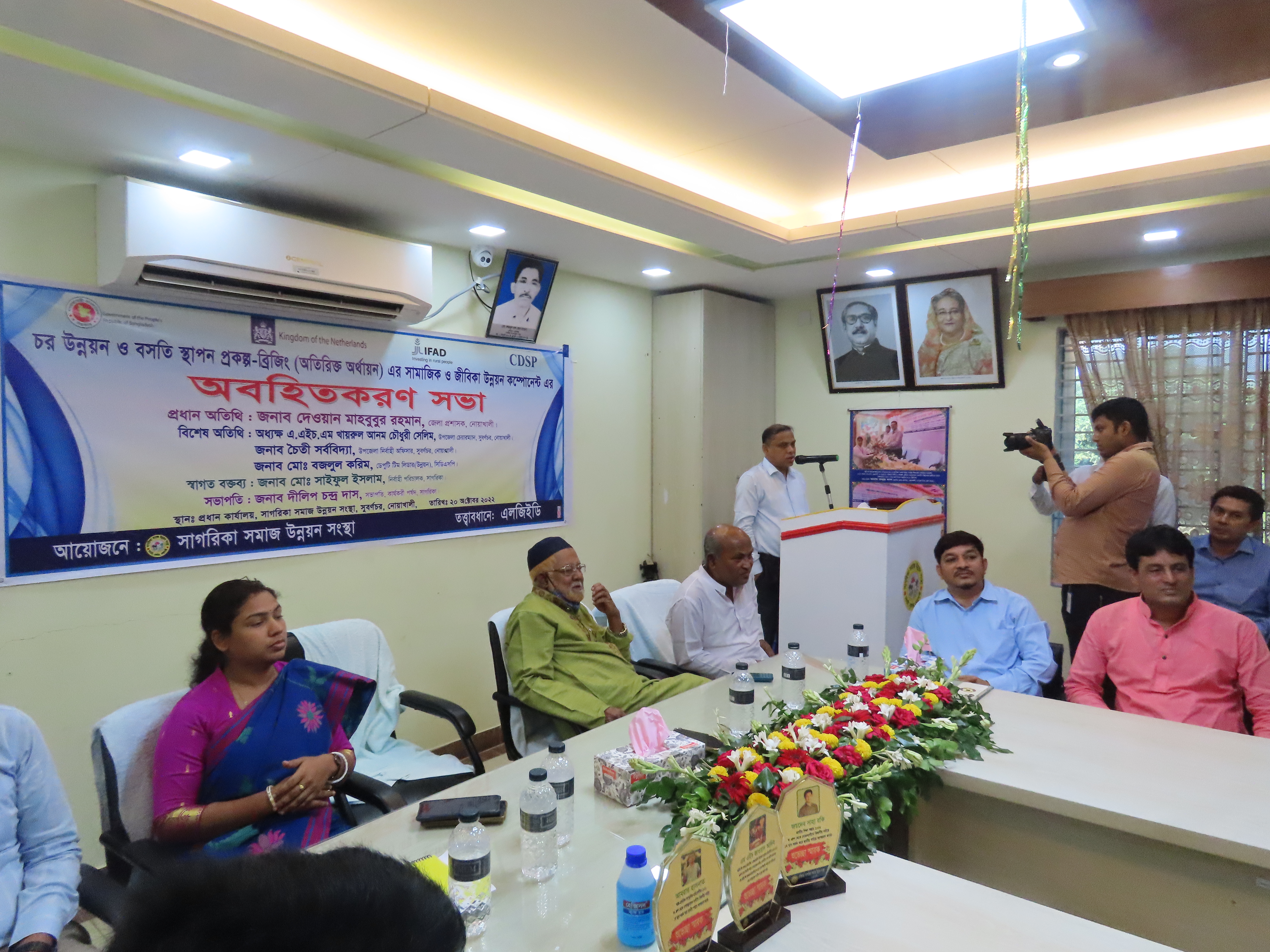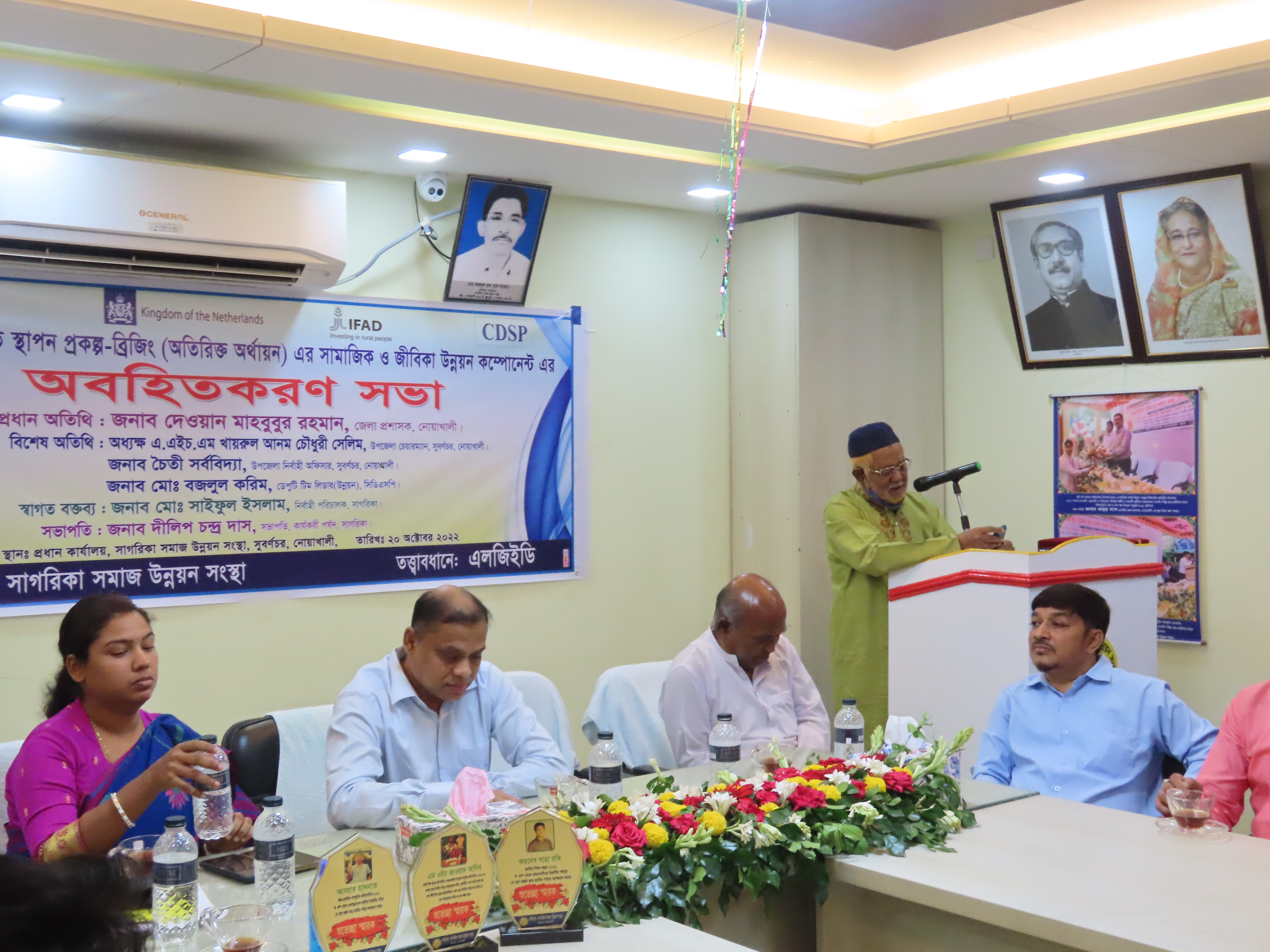 অবহিতকরণ সভাঃ প্রকল্পের শুরুতে বিভিন্ন স্টেকহোল্ডারদের নিয়ে ৩টি অবহিতকরণ সভা করা হয়। অবহিতকরণ সভায় প্রকল্পের সকল কার্যক্রম নিয়ে বিস্তারিত আলোচনা করা হয়। জেলার সুবর্ণচর উপজেলায় ২ টি এবং কোম্পানিগঞ্জ উপজেলায় ১টি অবহিত করণ সভার আয়োজন করা হয়। অবহিতকরণ সভায় নোয়াখালী জেলার মাননিয় জেলা প্রশাসক মহোদয় জনাব দেওয়ান মাহবুবুর রহমান, সুবর্ণচর উপজেলার উপজেলা চেয়ারম্যান জনাব আনম খায়রুল আনম চৌধুরী সেলিম, সুবর্ণচর উপজেলার উপজেলা নির্বাহী অফিসার জনাব চৈতী সর্ববিদ্যা, কোম্পানীগঞ্জ উপজেলার উপজেলা নির্বাহী অফিসার জনাব মোঃ মেছবাউল আলম ভূইয়া, সিডিএসপি প্রকল্পের ডেপুটি টিম লিডার(উন্নয়ন) জনাব মোঃ বজলুল করিম, সাগরিকা সমাজ উন্নয়ন সংস্থার নির্বাহী পরিচালক জনাব মোঃ সাইফুল ইসলাম, এলজিইডির এগ্রিকালচার অফিসার জনাব রবিউল ইসলামসহ সংস্থা বিভিন্ন স্তরের কর্মকর্তা, সিডিএসপি টিএ টিমের কর্মকর্তা, উপজেলা কৃষি, মৎস্য ও প্রাণিসম্পদ কর্মকর্তা, স্থানীয় গণ্যমাণ্য ব্যাক্তিবর্গ, প্রকল্প এলাকার বিভিন্ন শ্রেণির ব্যাক্তিগণ উপস্থিত ছিলেন।