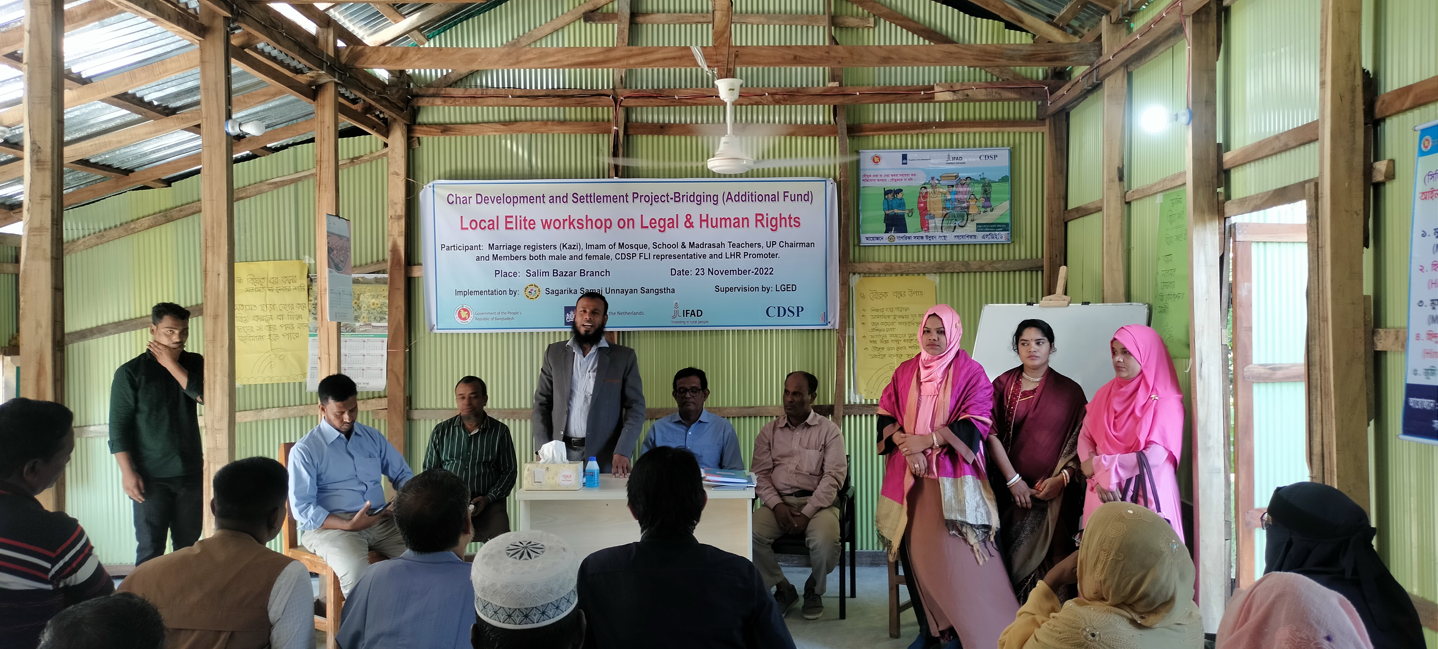 সিডিএসপি প্রকল্পের চরাঞ্চলের জনগণের মাঝে আইন ও মানবাধিকার বিষয়ক শিক্ষা ও সচেতনতার হার খুবই কম বিধায় এ পরিস্থিতি উন্নয়নে ৪ জন আইন ও মানবাধিকার কমীর্ এবং ২০ জন আইন ও মানবাধিকার প্রমোটর কাজ করছেন। বর্তমানে প্রকল্প এলাকায় ২০ জন আইন ও মানবাধিকার প্রমোটর দ্বারা মাইক্রোফিন্যান্স সমিতে নারীদের মাঝে ৫ টি জাতীয় মৌলিক আইন শিক্ষা (ভূমি আইন, মুসলিম পারিবারিক আইন. মুসলিম উত্তরাধিকার আইন, হিন্দু পারিবারিক আইন ও হিন্দু উত্তরাধিকার আইন) বিষয়ক কার্যক্রমের ৬ দিন মেয়াদী ক্লাস চলছে। এই কার্যক্রমে নারীদের মাঝে ব্যাপক সাড়া পড়েছে। চলতি বছর ২০ জন আইন ও মানবাধিকার প্রমোটর মোট ৩০৫ টি ক্রেডিট গ্রুপে ৬ দিন ব্যাপি মোট ৮৪৭৩ জন সদস্যকে প্রশিক্ষণ দিয়েছে। আইন ক্লাস পরিচালনার ফলে, ভূমি আইন, মুসলিম পারিবারিক. মুসলিম উত্তরাধিকার, হিন্দু পারিবারিক ও হিন্দু উত্তরাধিকার সম্পর্কে সমিতির সদস্যগণ সম্যক ধারনা লাভ ও সচেতন হয়েছে।