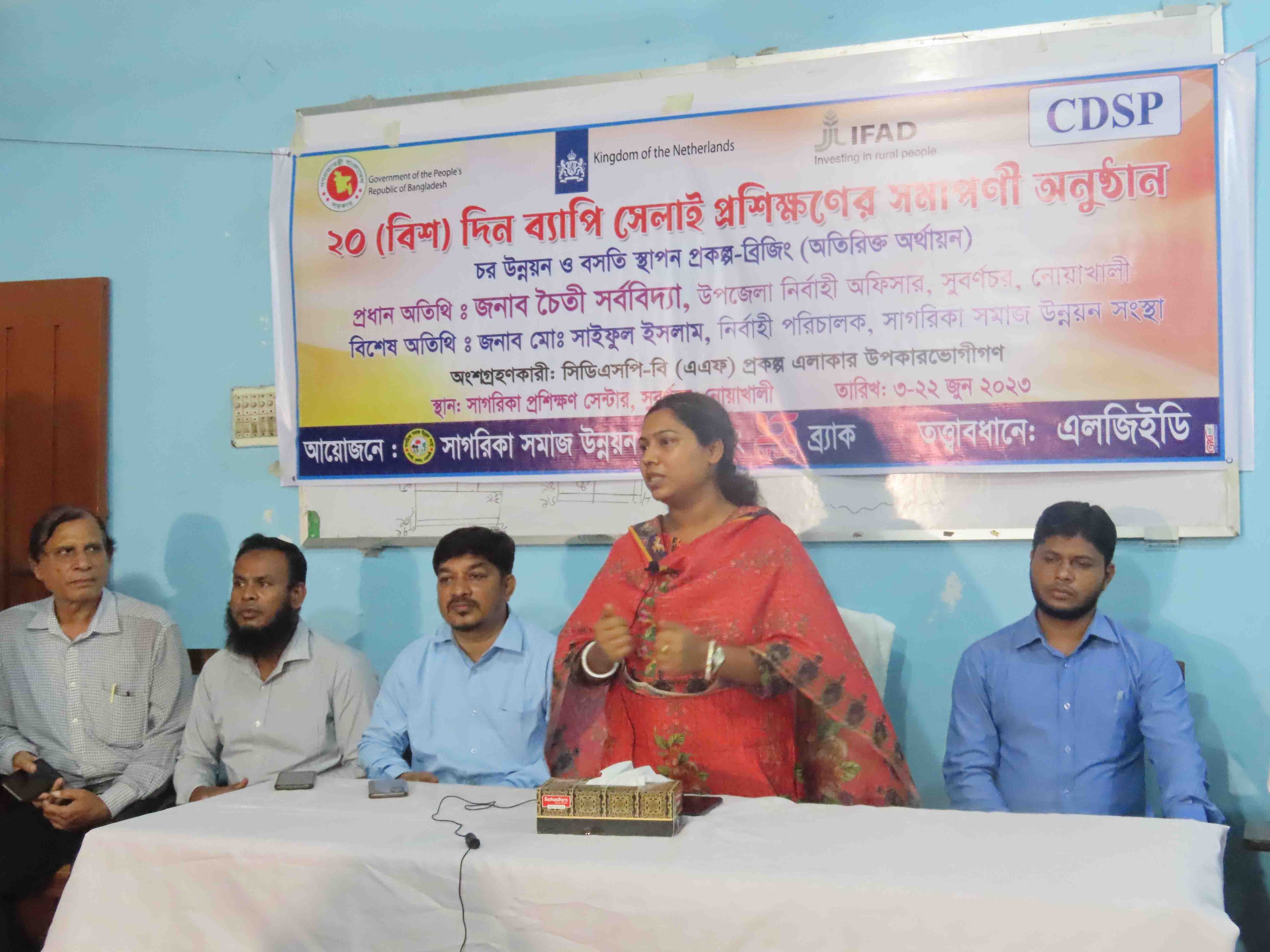 টেইলারিং প্রশিক্ষণে বক্তব্য রাখছেন জনাব চৈতী সর্ববিদ্যা, উপজেলা নির্বাহী অফিসার, সুবর্ণচর উপজেলা।