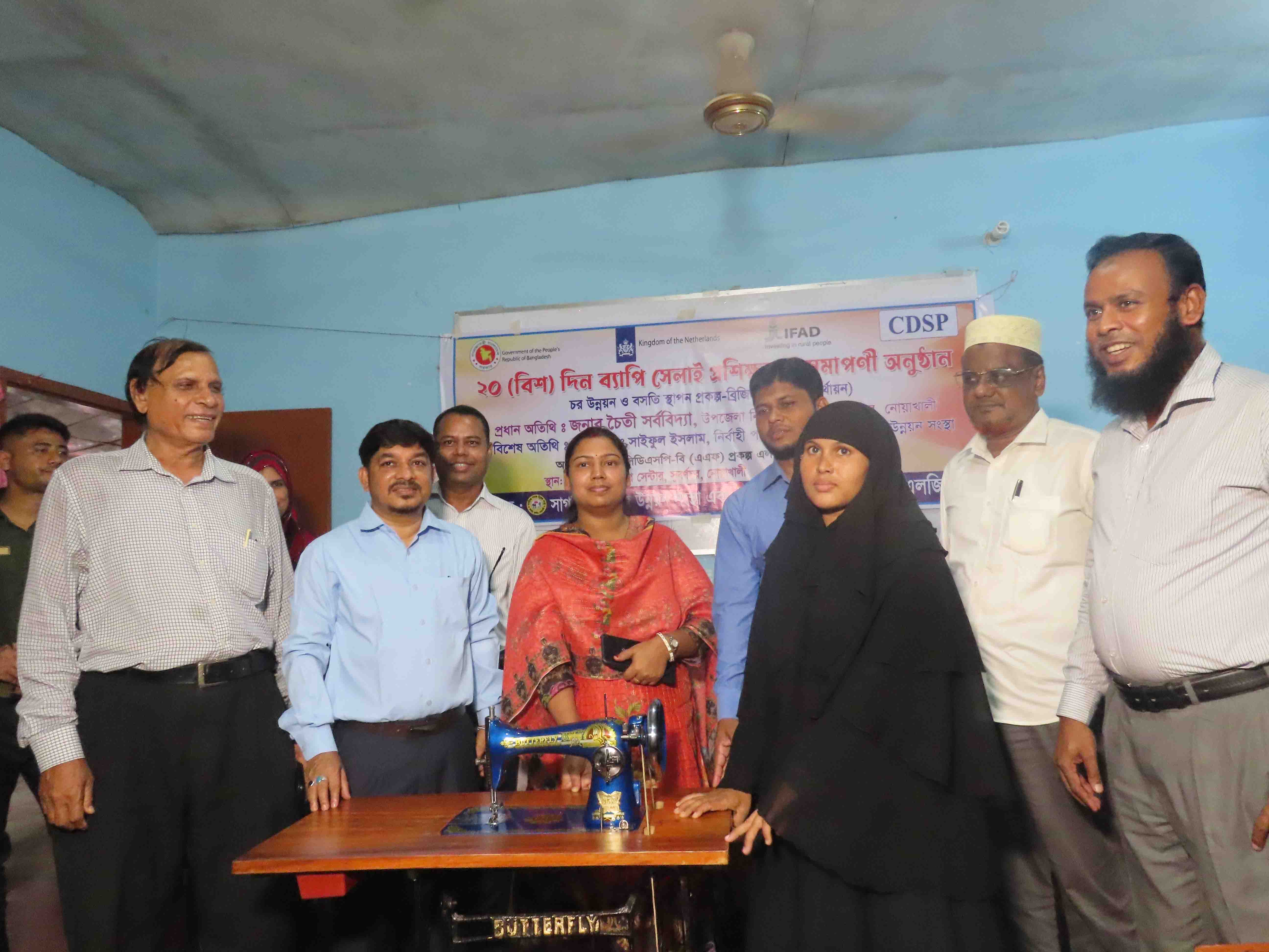 টেইলারিং প্রশিক্ষণ শেষে সদস্যদের মাঝে সেলাই মেশিন বিতরণ করছেন জনাব চৈতী সর্ববিদ্যা, উপজেলা নির্বাহী অফিসার, সুবর্ণচর উপজেলা ও জনাব মোঃ সাইফুল ইসলাম, নির্বাহী পরিচালক, সাগরিকা।