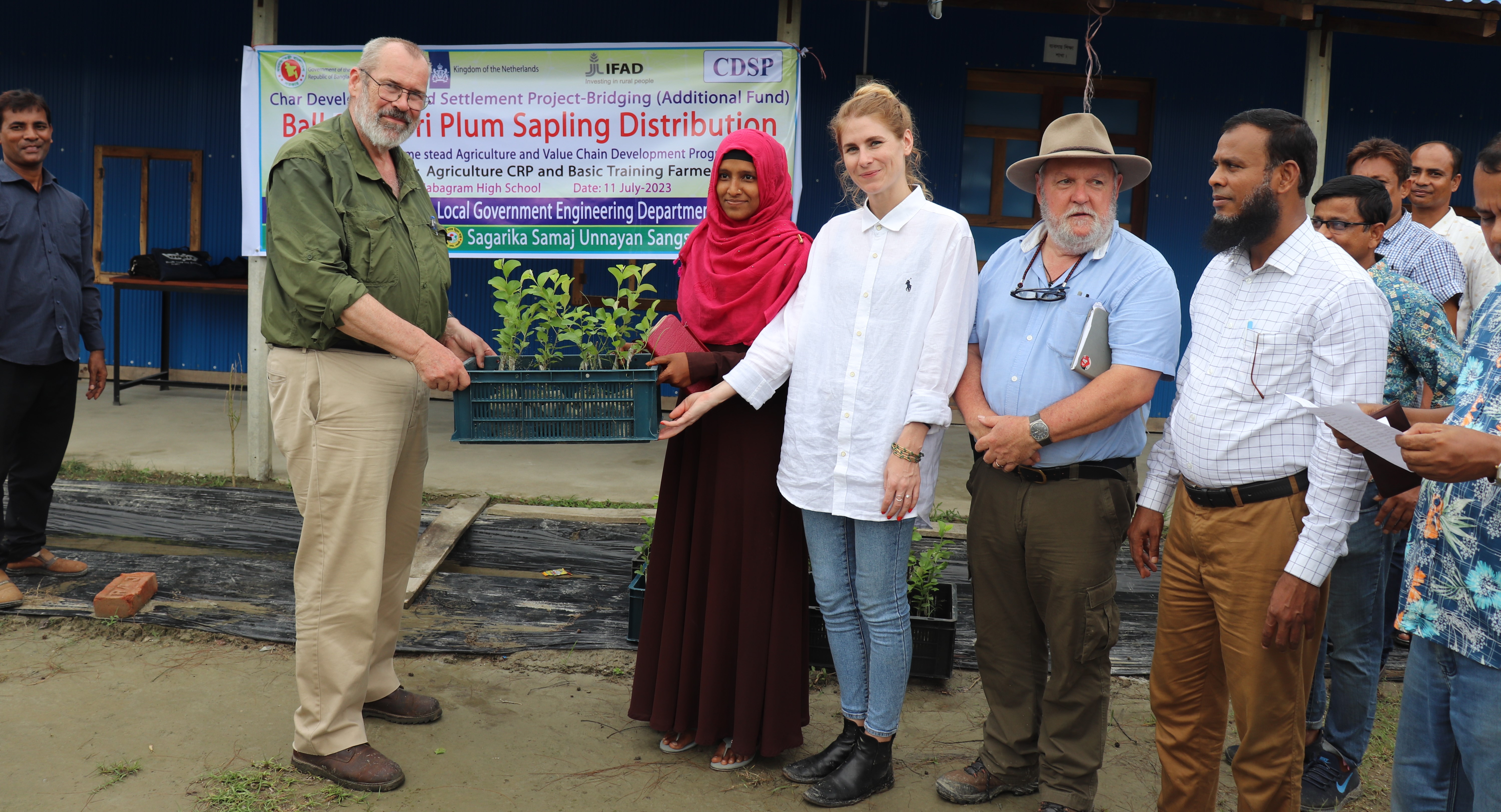 সিডিএসপি’র টিম লিডার জনাব এনড্রো জেনকিন ও মিশন টিমের সদস্যগণ উপকারভোগীদের মাঝে বল সুন্দরী জাতের কুলের চারা বিতরণ করছেন।