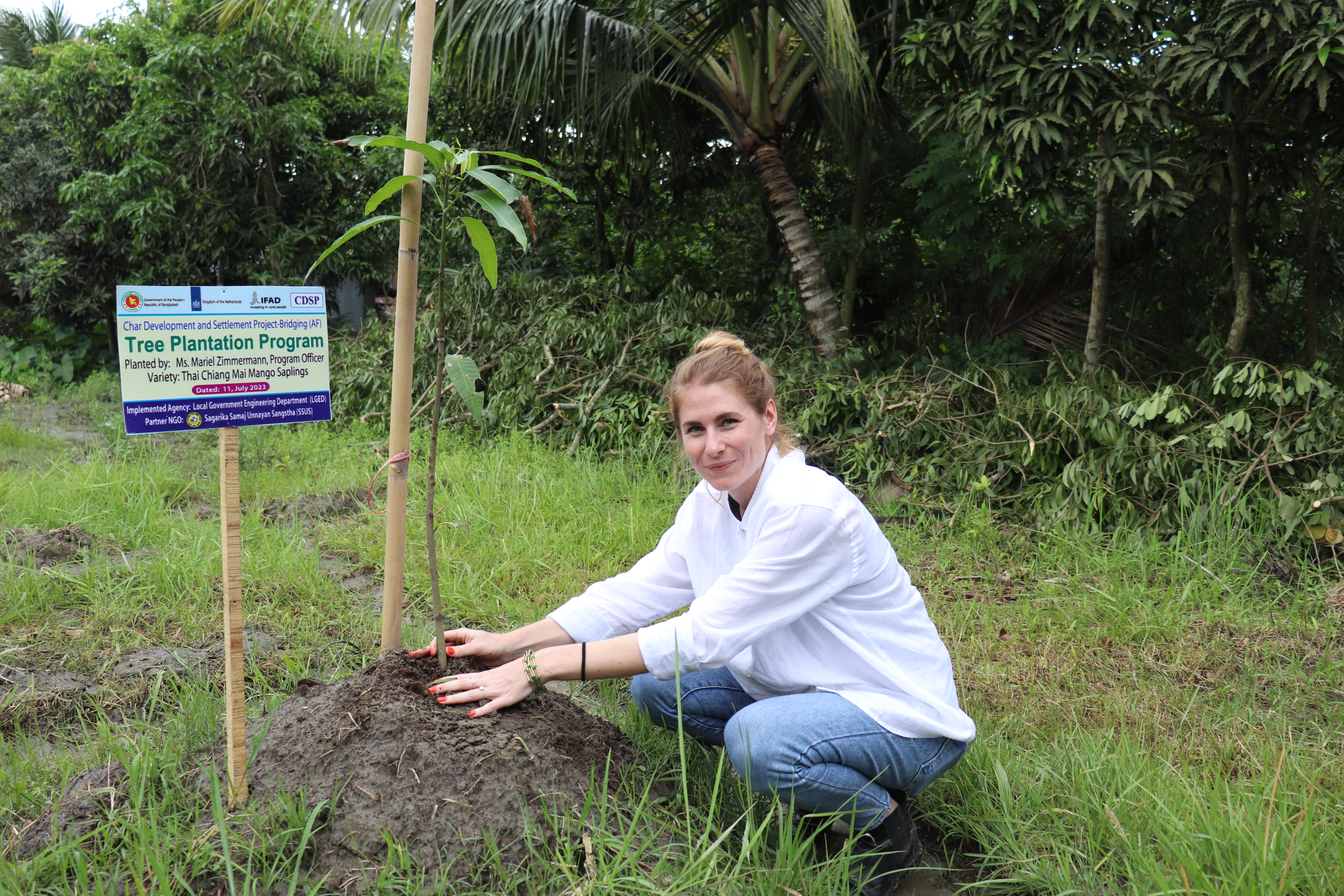 বৃক্ষরোপন কর্মসূচিতে বৃক্ষ রোপন করছেন মিশন টিমের সদস্য, মিস মারিয়েল জিমারম্যান।