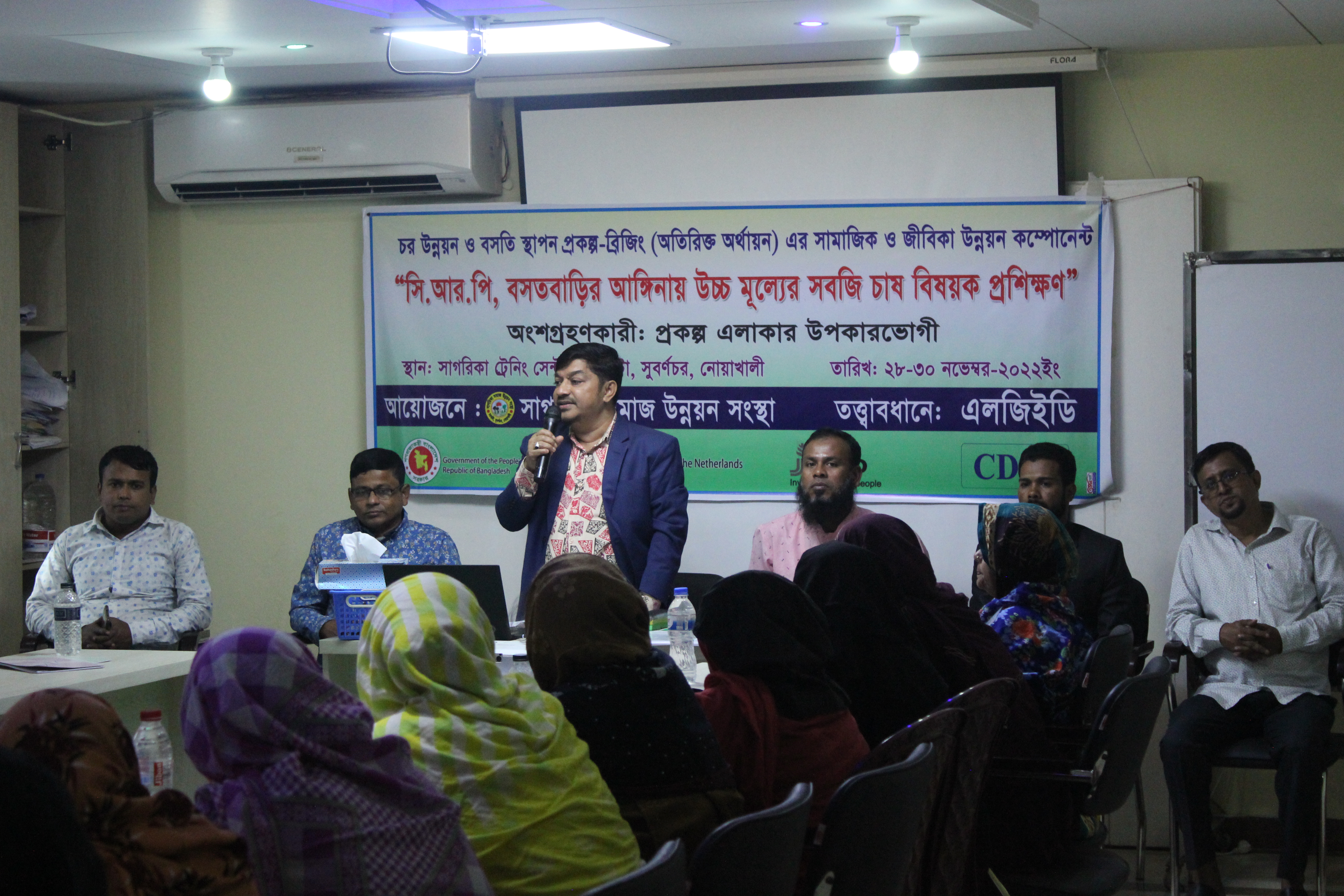বসতবাড়ির আঙিনায় উচ্চমূল্যের সবজি চাষ বিষয়ক প্রশিক্ষণে বক্তব্য রাখছেন জনাব মোঃ সাইফুল ইসলাম, নির্বাহী পরিচালক, সাগরিকা সমাজ উন্নয়ন সংস্থা, উপস্থিত আছেন জনাব মোঃ লিয়াকত আলী, এনএসএস, সিডিএসপি।